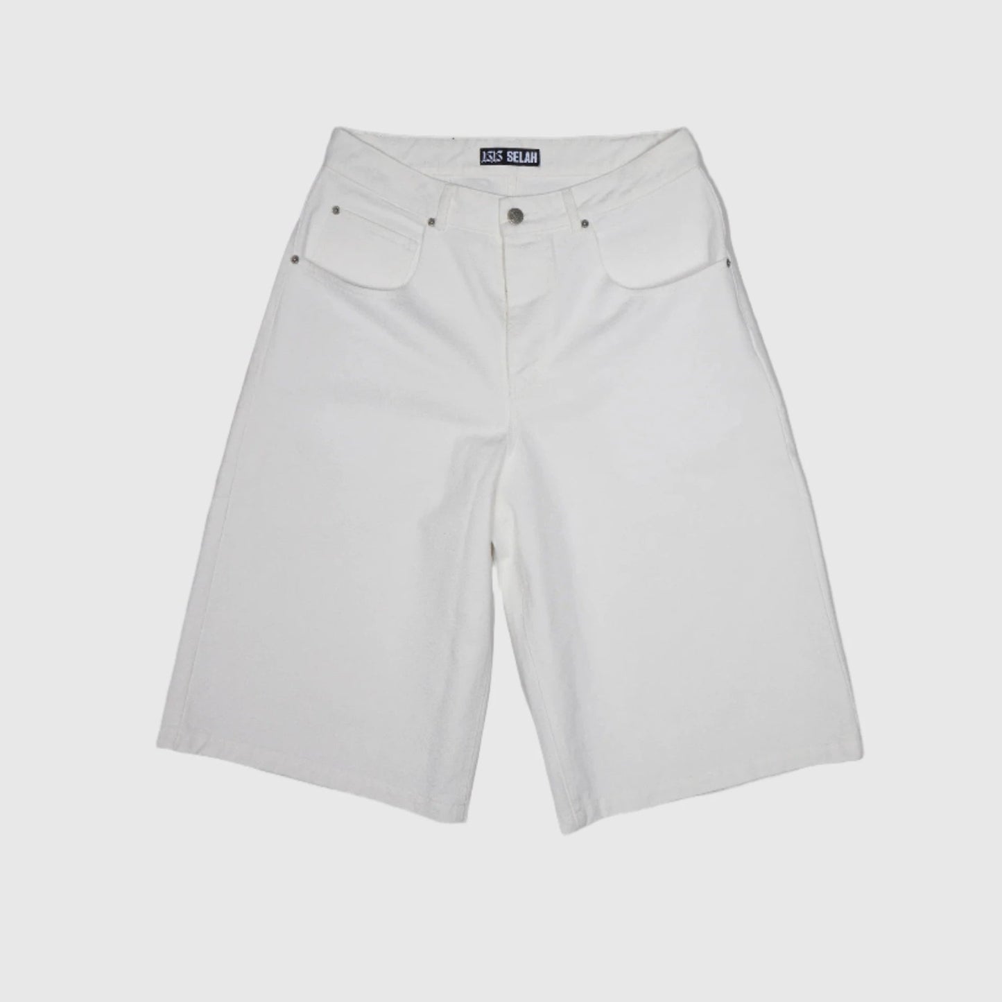 1313 SELAH five pocket denim shorts in off-white has a wide leg fit and baggy fit. The shank buttons and rivets features branding with an aged silver finish. PU leather patch at waistband has a blind embossing of the 1313 SELAH logo. Fabric COO Turkey
