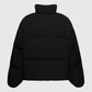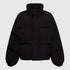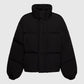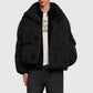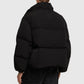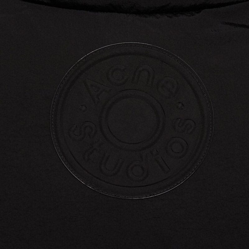 The Acne Studios Puffer Jacket in Black is crafted from nylon with a boxy silhouette and embossed logo detailing at the back. Filled with 90% down and 10% feathers, it offers warmth and insulation. Design features include a stand collar, two-way zip closure, elasticated drawstring waist, and zipped front pockets, while elasticated provide a snug fit around the wrists, helping to keep out cold air and retain warmth.