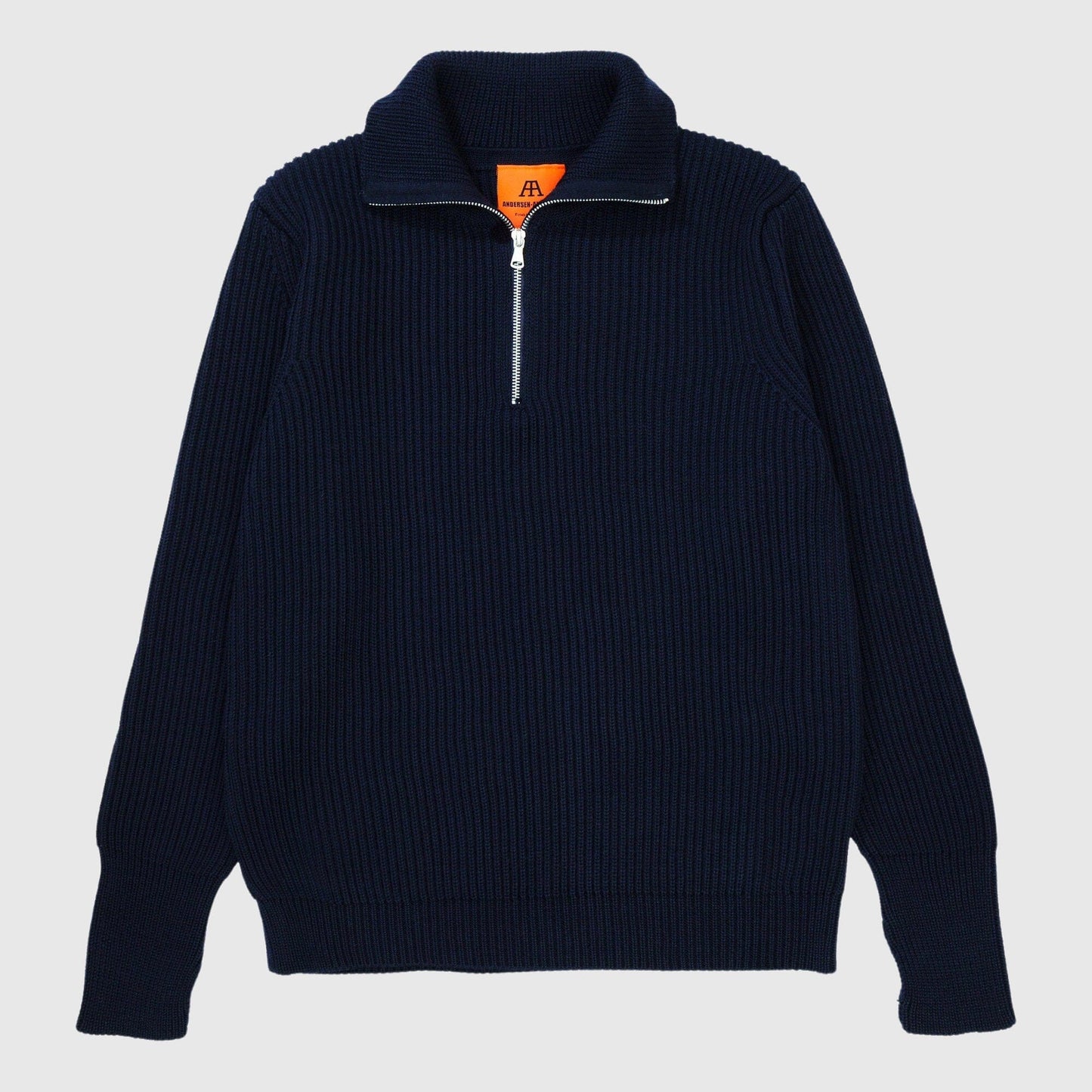 The wool originates from Patagonia and is spun in Italy Half zip sweater knitted in full cardigan stitch. Style has a regular fit with high collar and extended sleeve rib with thumb holes. Fully fashioned knitted and linked together. All assemblies are reinforced with bar tacks. Comes with a YKK nickel-free zipper. Knitted on a 5 gauge flat knitting machine with 6 threads extra spun, pure new wool for a heavy and durable quality.