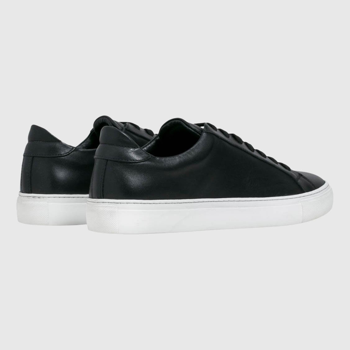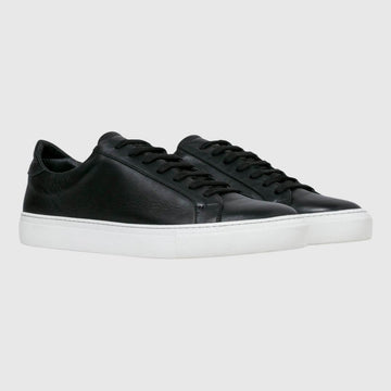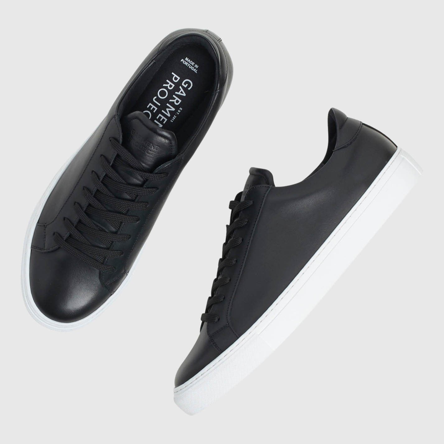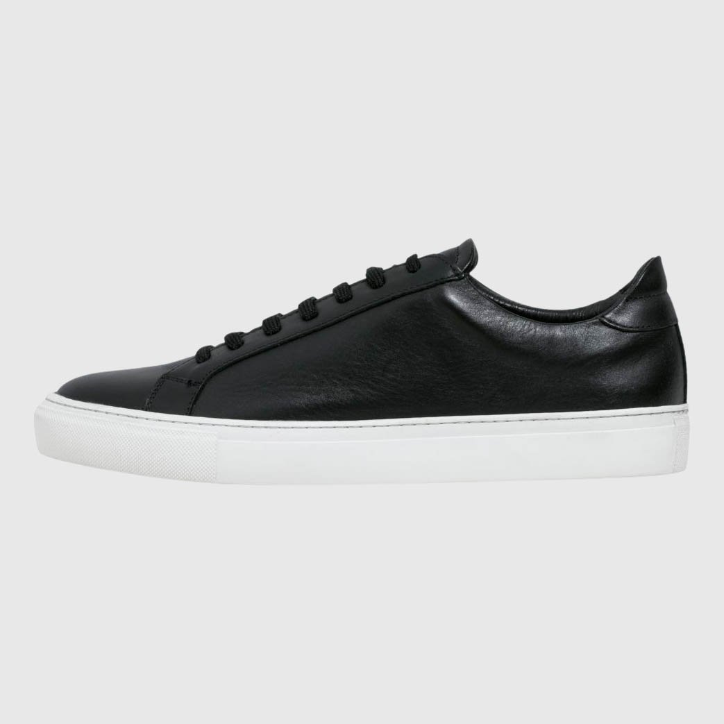 The Garment Project Leather sneakers are made with premium black leather and a signature cup sole. They come with nylon laces and a padded heel counter, as well as a leather lining and antibacterial memory foam in-sock.