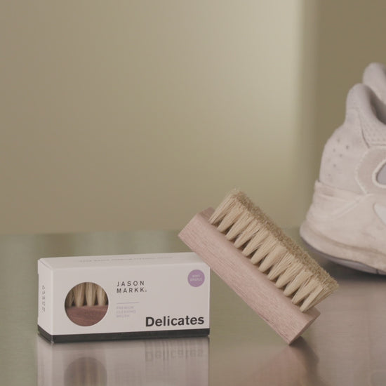 The Jason Markk Premium Brush is made from a hand crafted walnut wood handle and is made of soft hog's hair excellent for delicate materials like suede, mesh, cotton canvas and more.