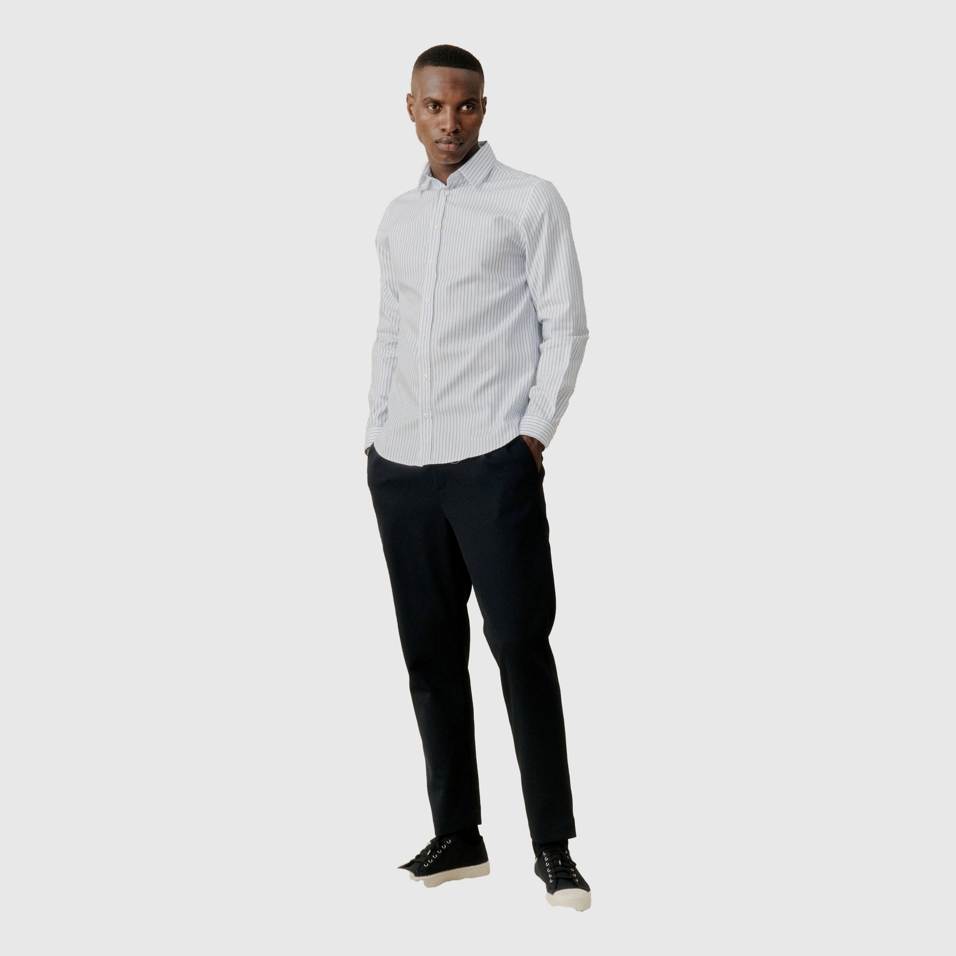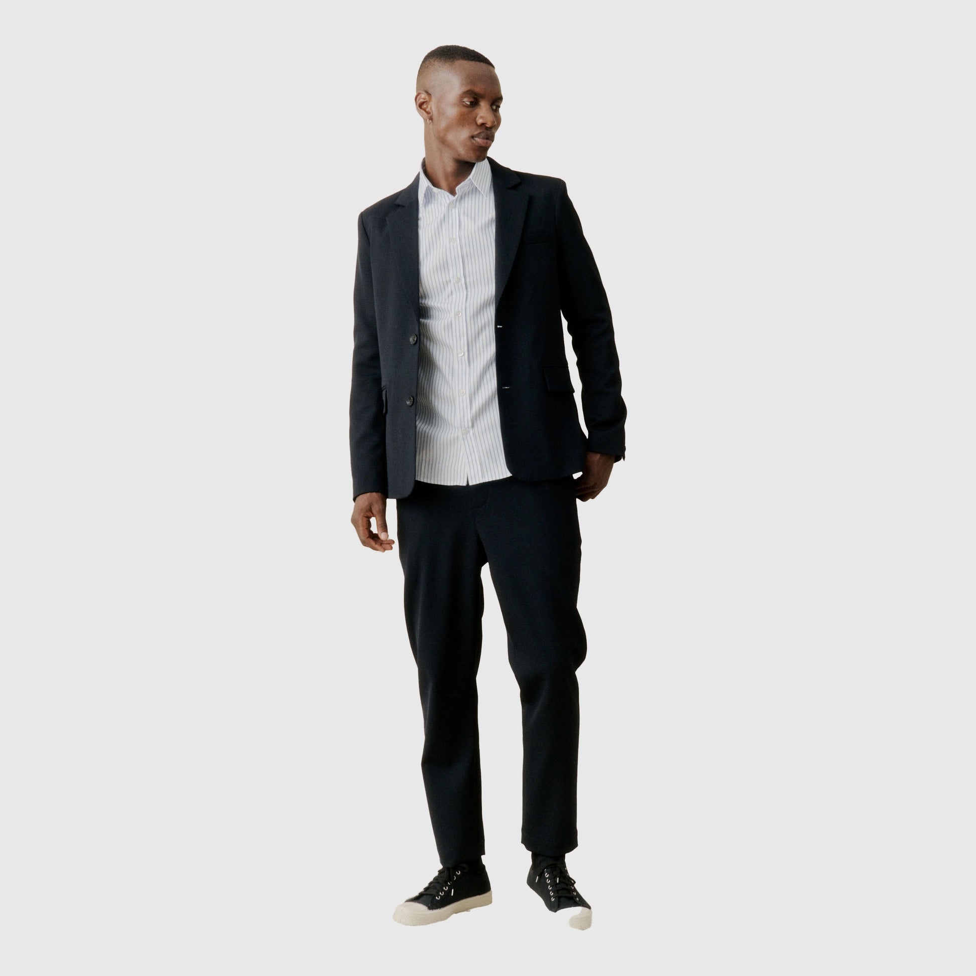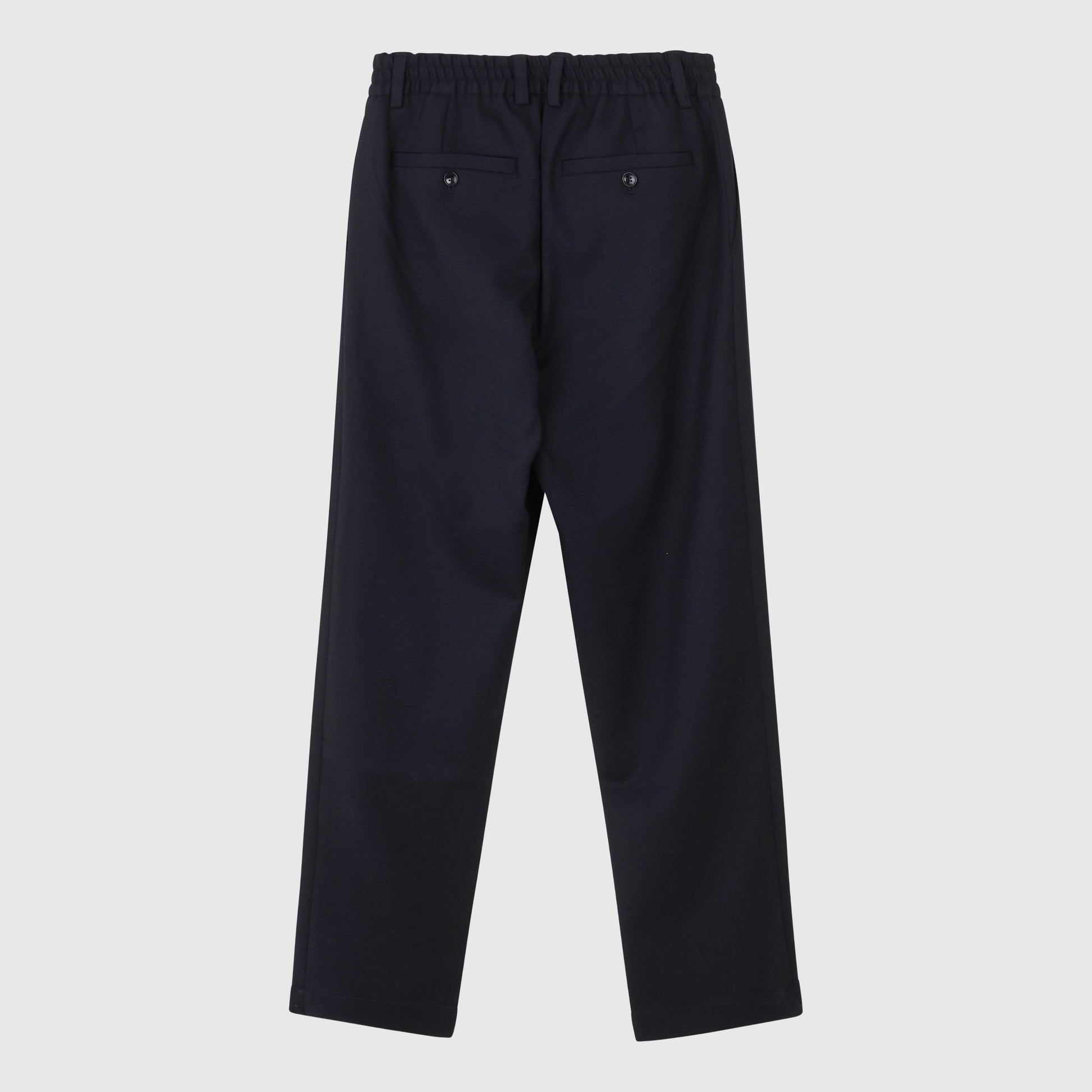 Contemporary tailoring for versatile use. The Smoke trouser is a relaxed moderate wide-fit with elasticated waist, center front zip fly and button closure. Welt pockets at the back and slanted pockets at the front. The perfect everyday essential. The Smoke trouser is cut from structured a polyester/wool blend with stretch for the perfect comfort.