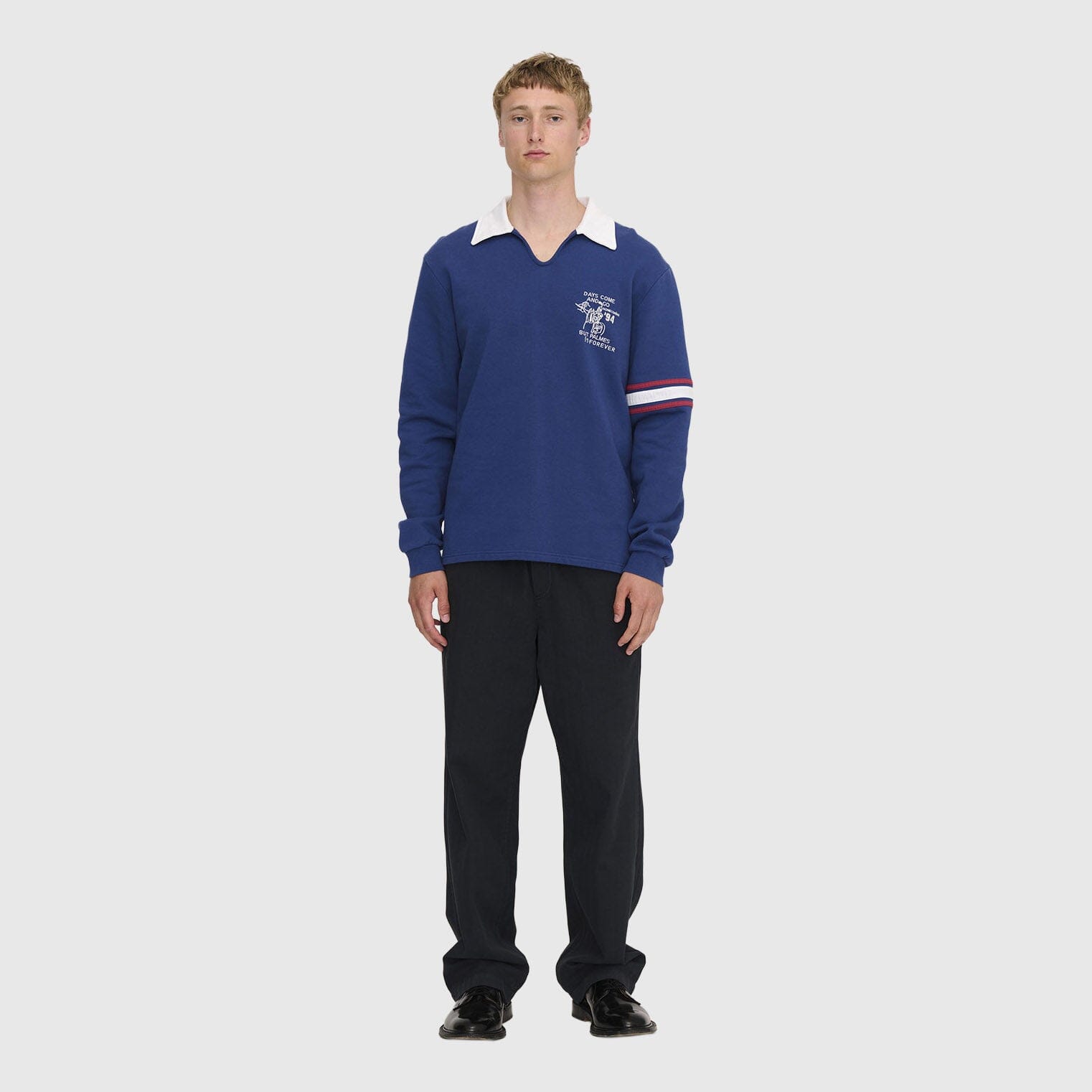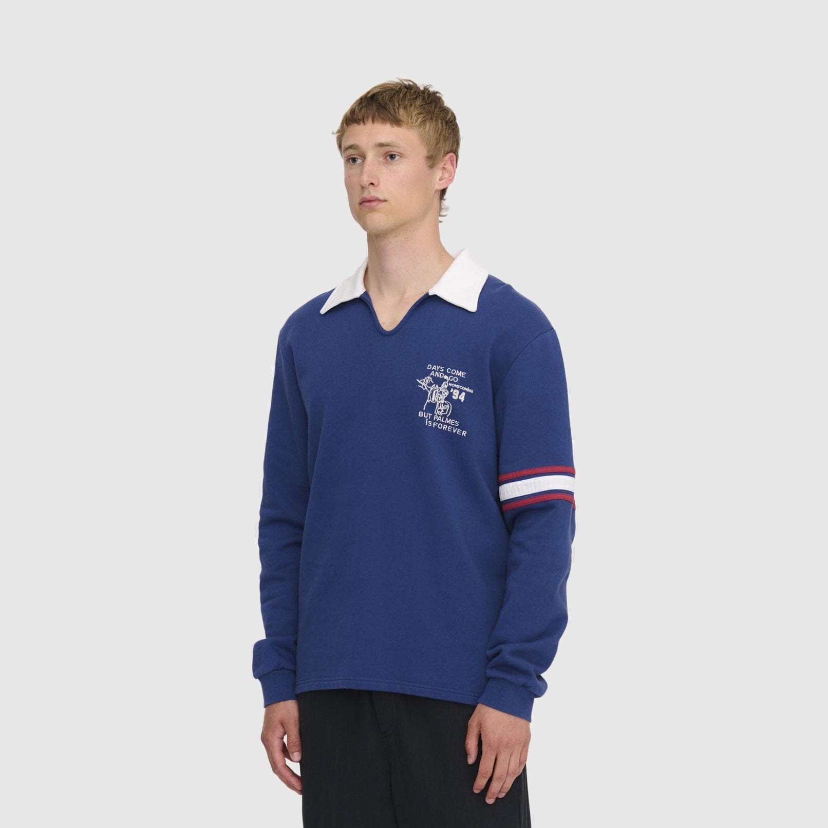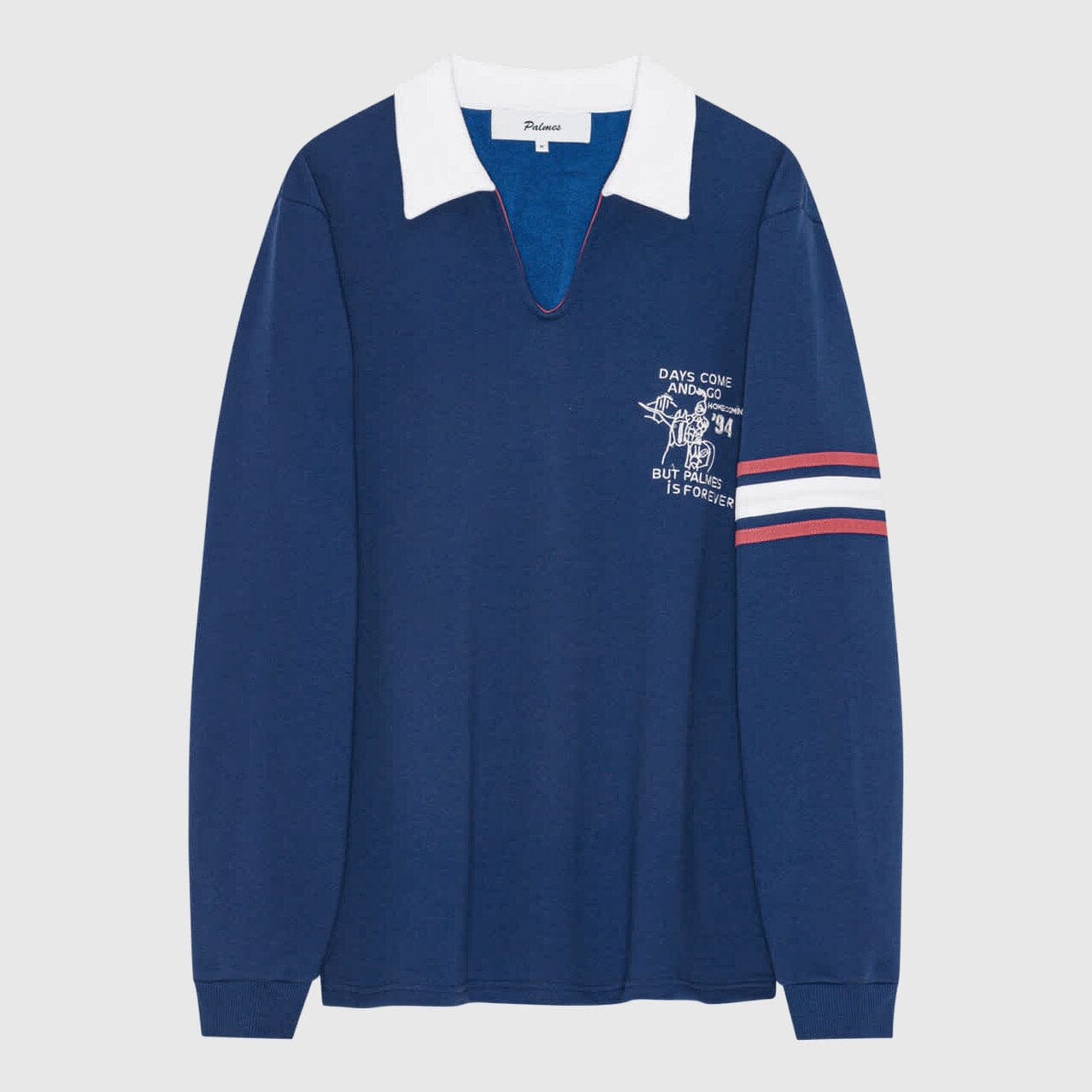 Open-necked rugby shirt from Palmes. Made from pre-washed 280gsm cotton for a worn-in feel, it has embroidery on the left chest and contrasting twill panels on the left sleeve.